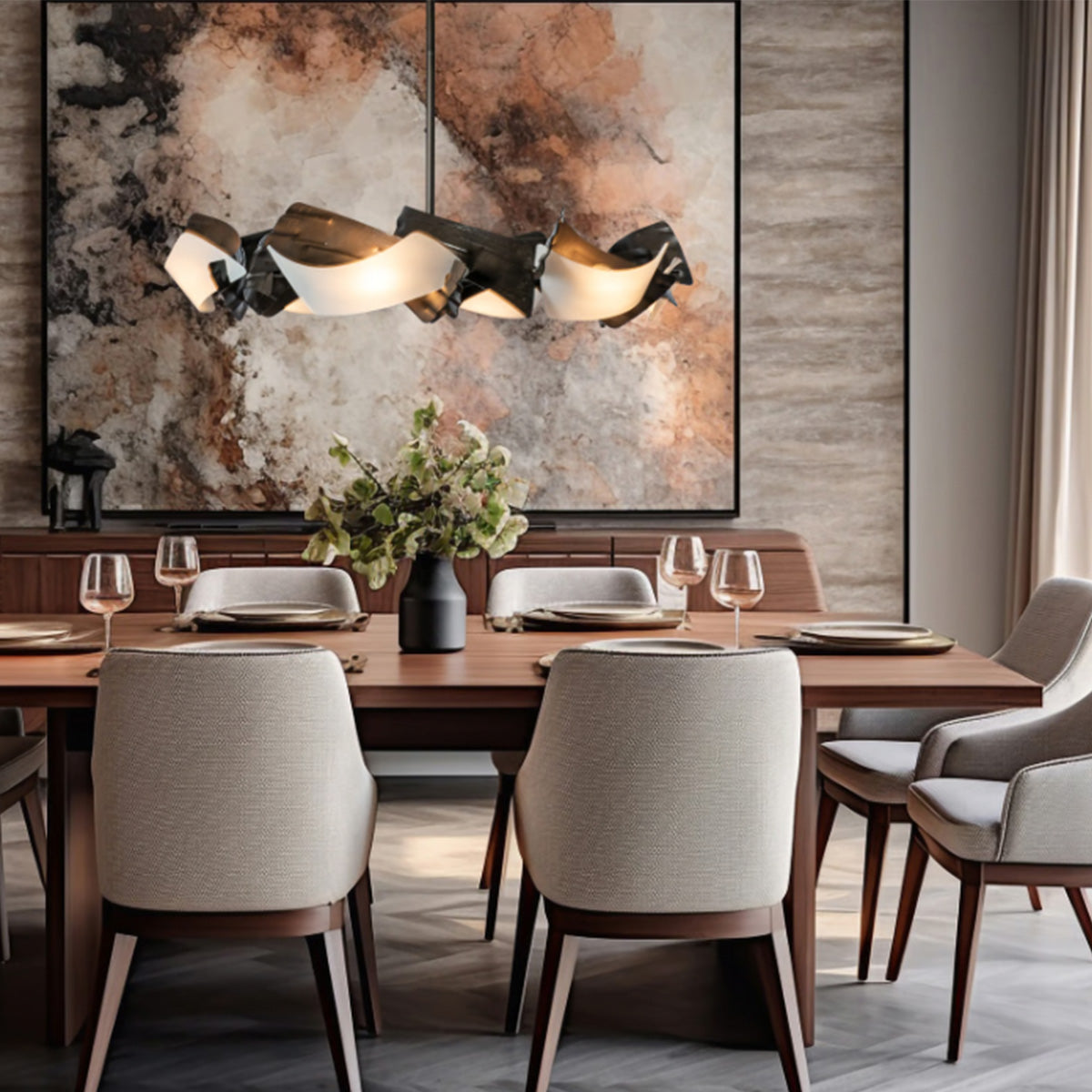 Designer Jason Hancock was inspired by the rolling waves of the sea, easily seen in the Crest Circular Pendant that embodies that essence of both strength and grace. Its hammered steel pattern, curved plates and art glass create a sense of ebb and flow with six lights illuminating the space.