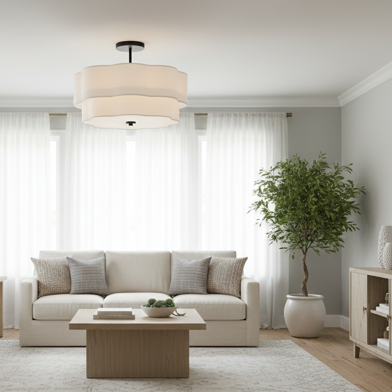 Splendidly soft, Gwen’s shapely scalloped shade complements inviting light with elegant layers of offwhite linen suspended from delicate chains and minimal metal stems. A Black or Lacquered Brass finish provides a versatile complement to any interior style.