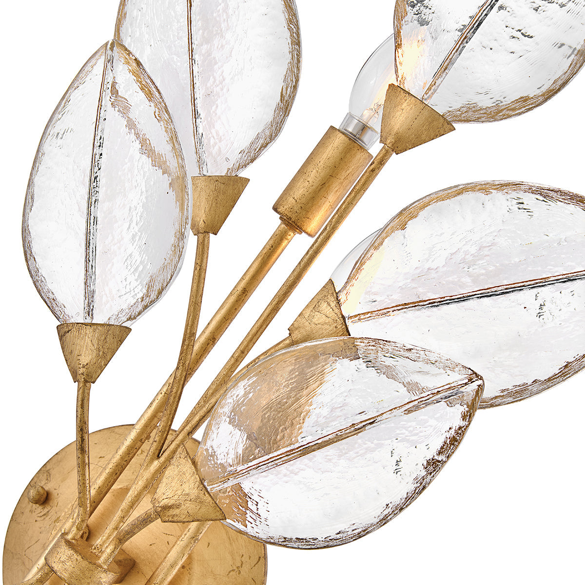 Romantic and elegant, Amira’s floral and vine-inspired design features clear pressed glass leaves hand-painted with delicate gold detailing. A refined Distressed Brass frame evokes a timeless charm.
