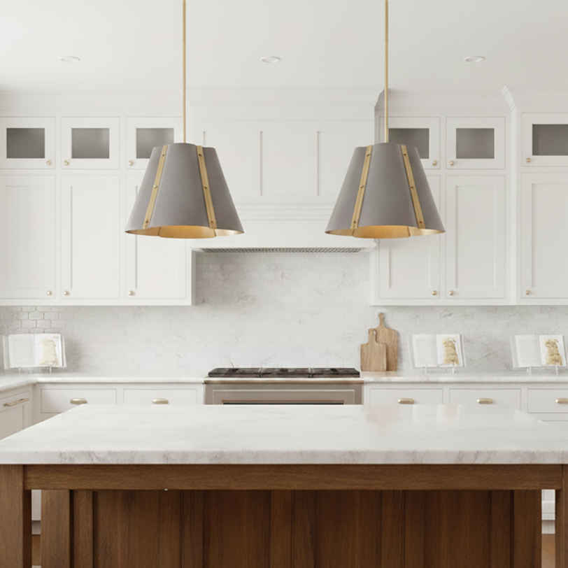 Strong in style and design, Bowman’s makes a transitional statement with a tapered quatrefoil shade accented by decorative knobs along symmetrical vertical supports. Heritage Brass or Slate Bronze finishes complement any living or dining décor with polished metallic tones.