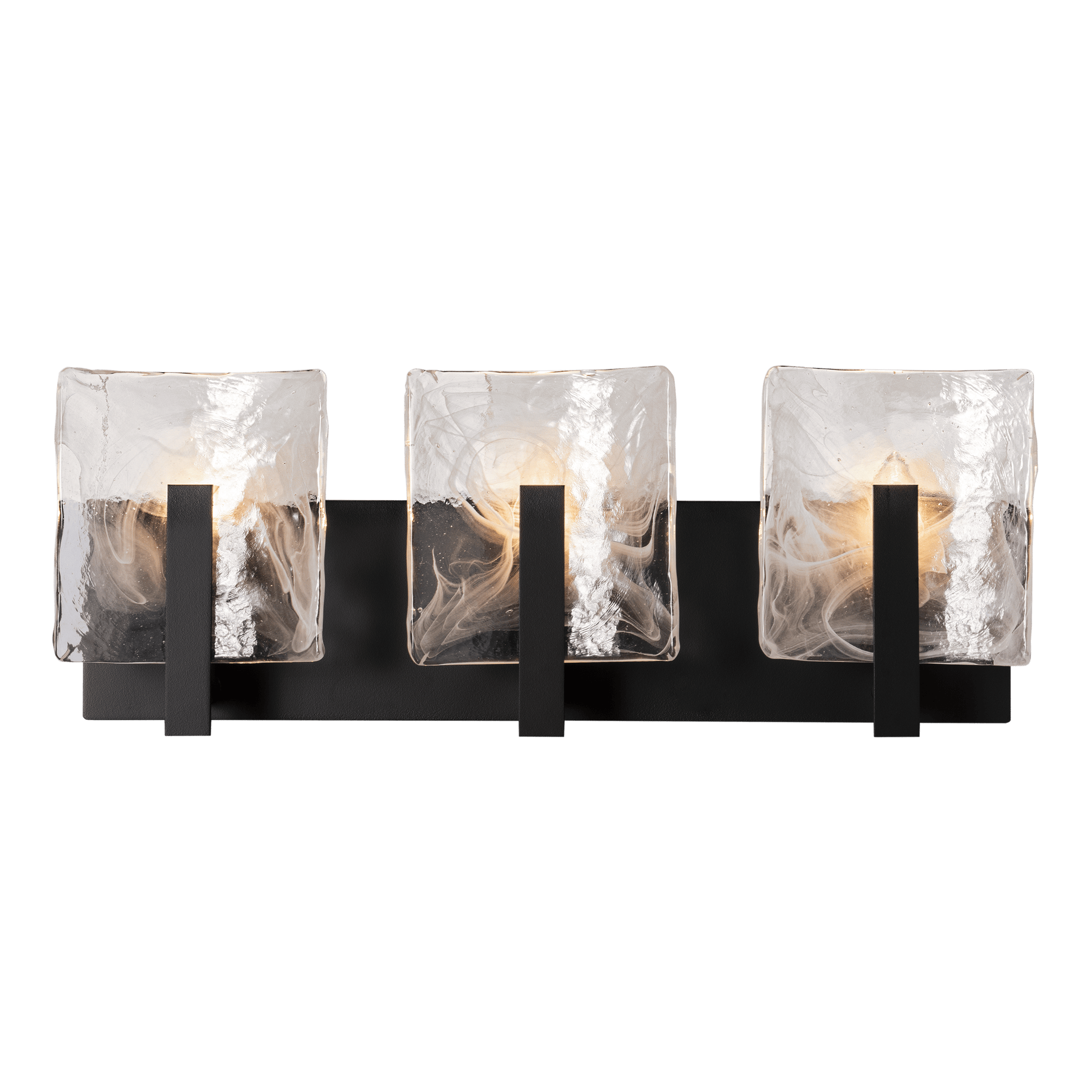 A large square thick convex glass panel that is clear with a freeform white swirl is held by a single, vertical handcrafted steel bar in the Arc 1-Light Bath Sconce.