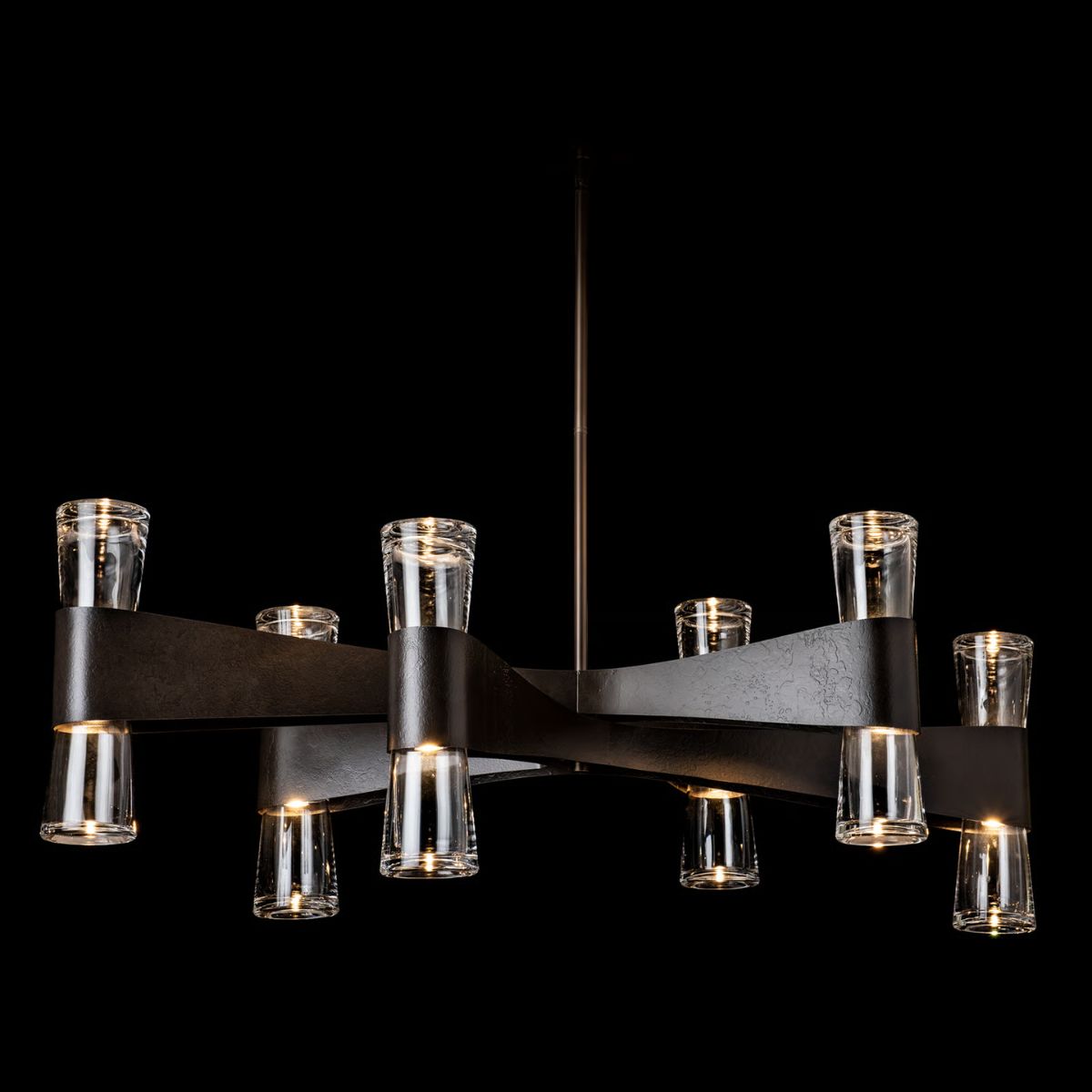 Artisanal forging on display, this grand Bellis chandelier gives an oval shape with its outstretched arms. Stunning, classic with a transitional style, the Bellis is a showstopper. Each of the six arms holds a duo of light. Up- and downlights are contained within crystal clear, thick, slightly flared glass. Available in any of our standard interior finishes.