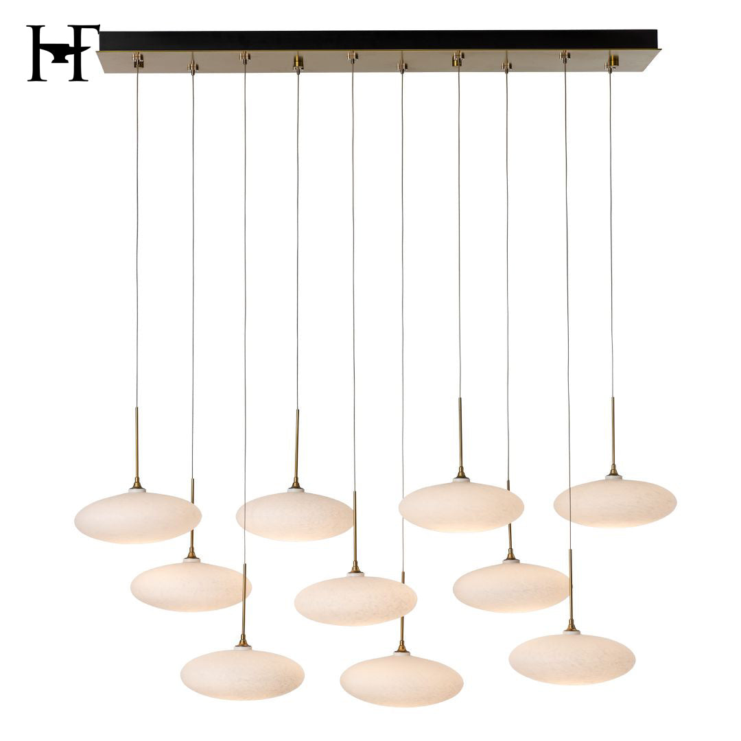 Inspired by nature, 10 white tortoiseshell-like glass shades give this pendant its name: Clouds. Each individual Cloud pendant can be easily staggered in height to customize your installation. The rectangular canopy allows for cable adjustments with no need to cut them, giving you the opportunity to change pendant heights at any time.