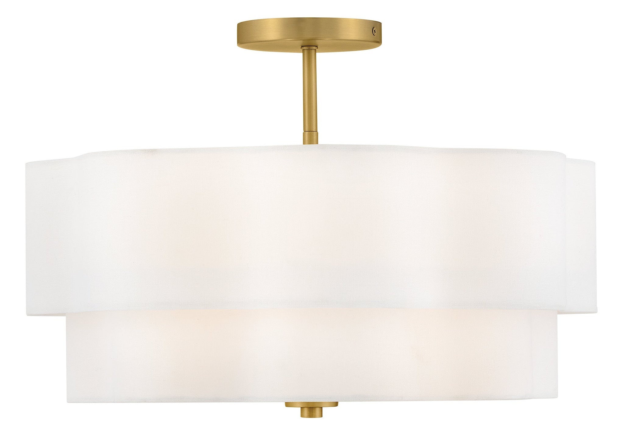 Splendidly soft, Gwen’s shapely scalloped shade complements inviting light with elegant layers of offwhite linen suspended from delicate chains and minimal metal stems. A Black or Lacquered Brass finish provides a versatile complement to any interior style.