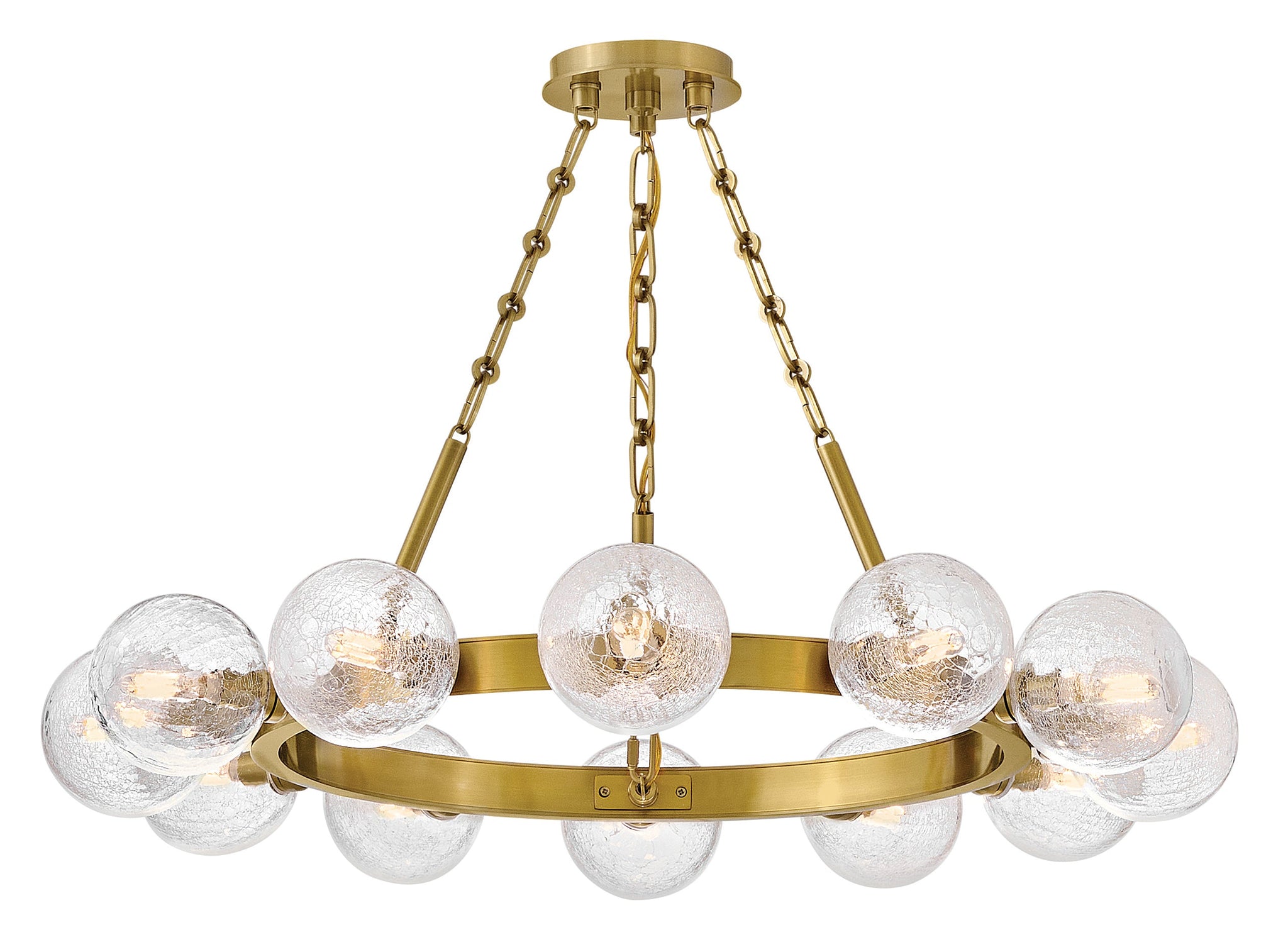 Dramatic crackled glass globes surround Coco's timeless silhouette with unexpected, distressed detailing. Minimal framing suspended from decorative stem-to-chain uprights features a warm and inviting Lacquered Brass finish.