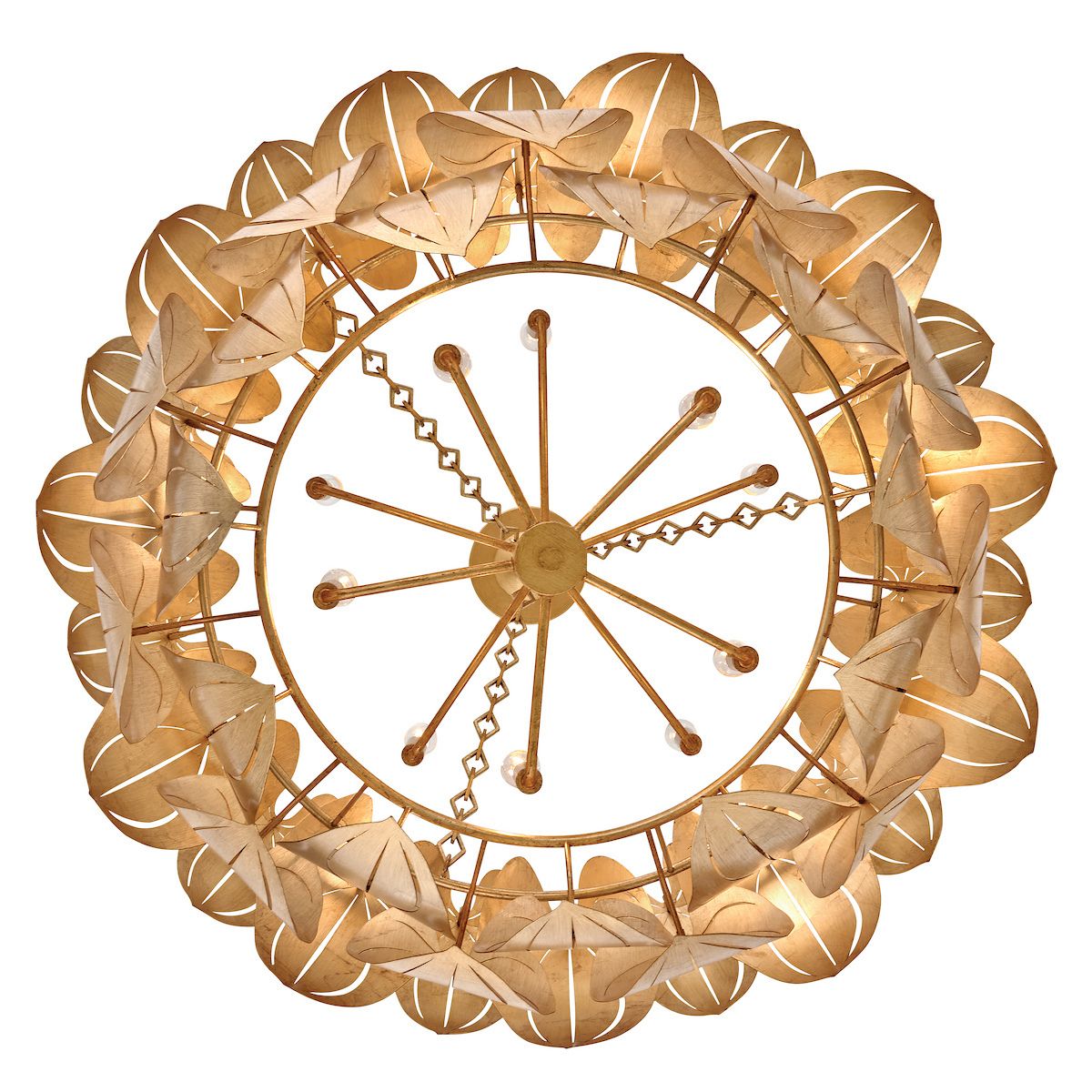 Inspired by the grand leaves and distinct veining of anthurium plants, found in the tropical cloud forests of South America, Camille brings botanical beauty to your living space. Each Distressed Brass layer is artfully laser-cut, shaped, and hand-painted with gold leaf to create a luxe transitional design, suspended by diamond-shaped chains and a tapered canopy.