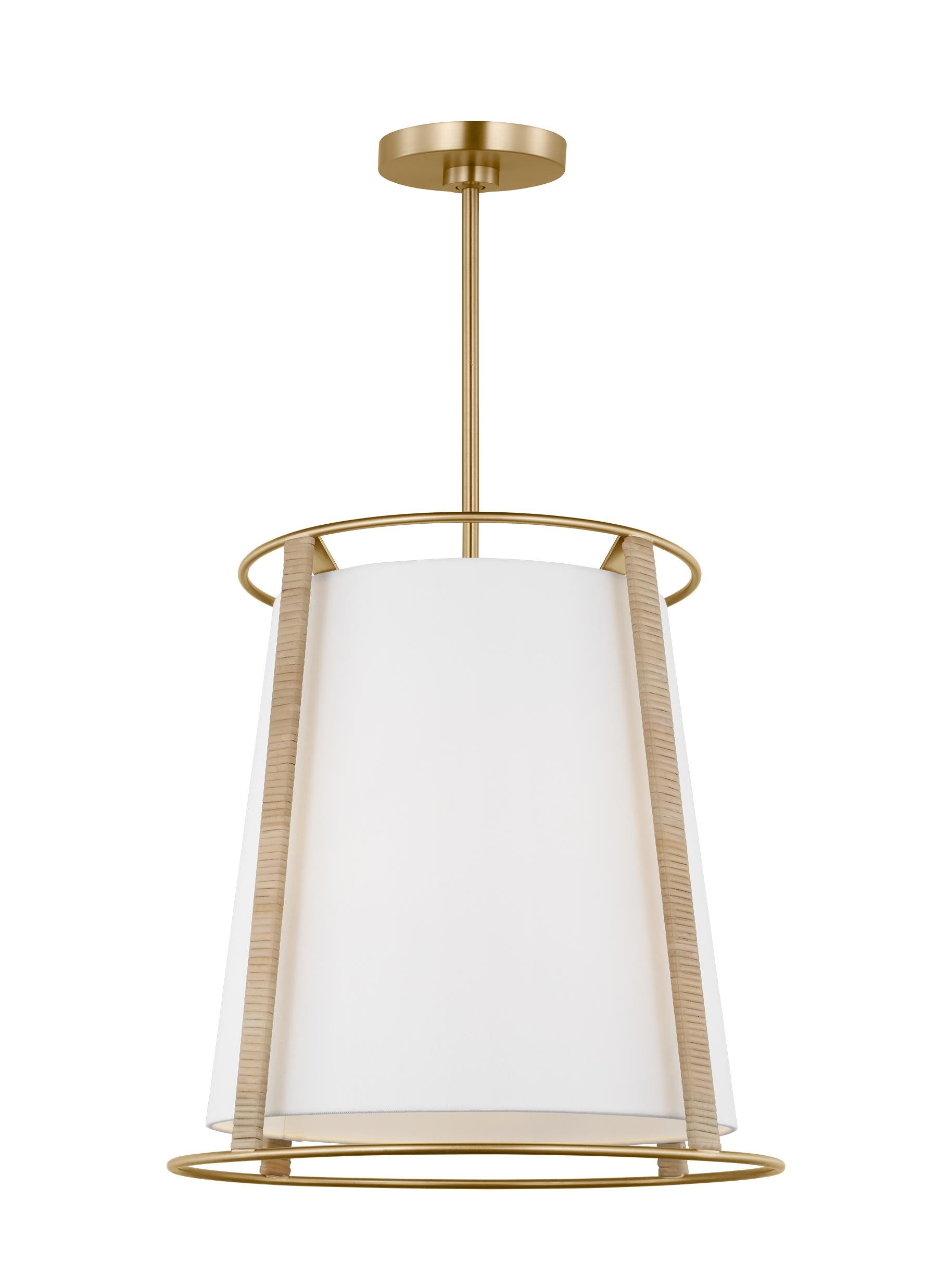 The Cortes hanging shade pendant by Drew & Jonathan delivers a harmonious blend of relaxed style and modern elegance. Its gently tapered white linen drum shade is held by rattan-wrapped spokes (with Satin Brass accents) or an Aged Iron frame, creating a breezy yet refined silhouette. This pendant is perfect for lounges, kitchens or dining areas.
